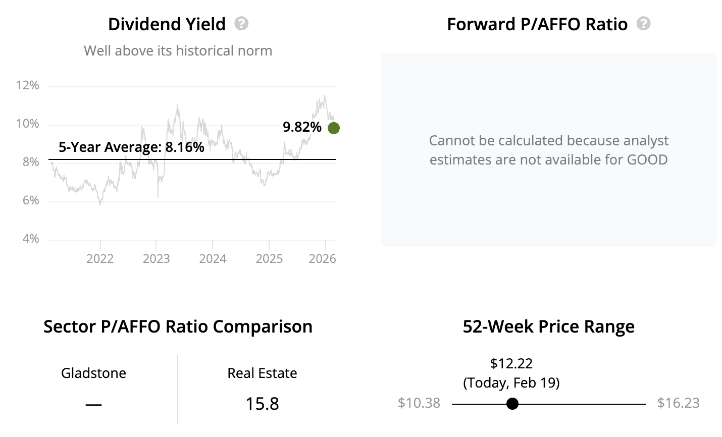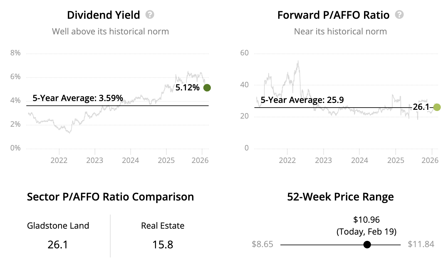 This has pushed the REIT's payout ratio above 100%, where it will remain until market conditions improve or the dividend is ultimately right-sized. Coupled with Gladstone Land's small size and external management structure, conservative income investors may prefer to look elsewhere for ideas.