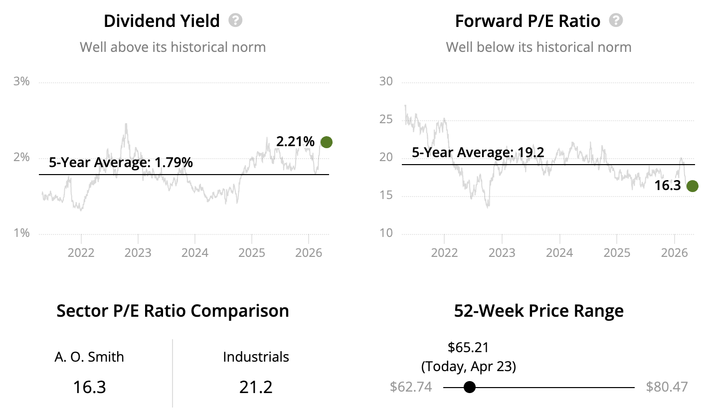 A. O. Smith, established in 1874, makes water heaters, boilers, and related water treatment products for residential and commercial markets. It sells primarily through wholesale distribution and retail channels, with meaningful operations in North America and other international markets.