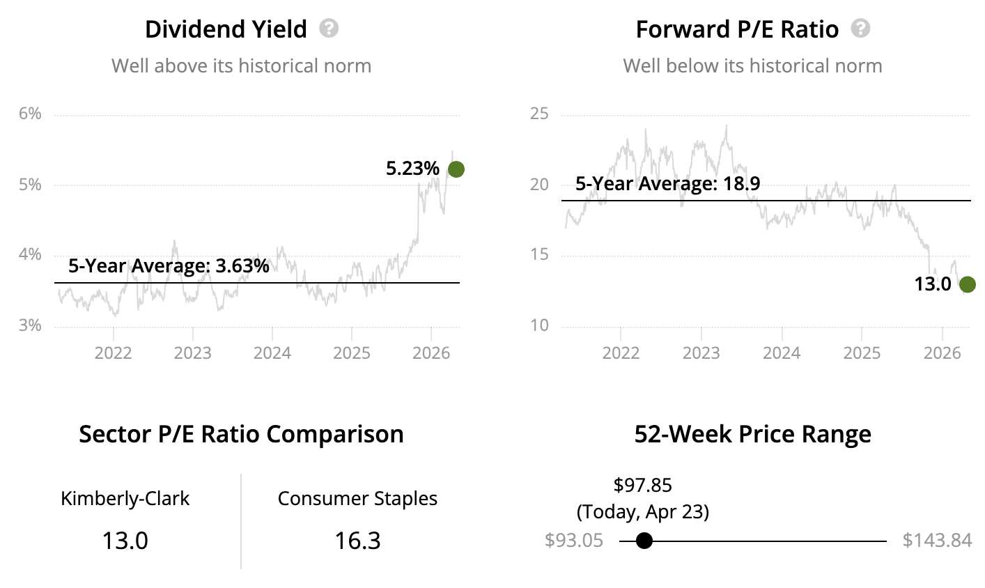 Kimberly-Clark, founded in 1872 as a paper mill in Wisconsin, sells tissue and personal care products such as diapers, wipes, toilet paper, and paper towels under brands like Huggies, Kleenex, and Cottonelle. Demand is relatively steady because many products are everyday necessities, though results depend on pricing and input costs.