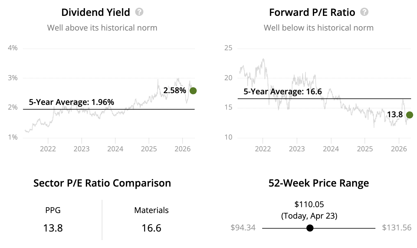 PPG, founded in 1883, manufactures paints and coatings used in industrial, automotive, aerospace, packaging, and architectural applications. Its products protect surfaces, improve durability, and enhance appearance, with demand tied to manufacturing activity and renovation cycles.