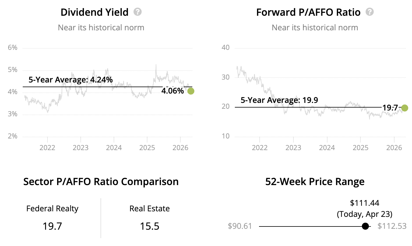 Founded in 1962, Federal Realty is one of the oldest REITs in the world. The company owns over 100 shopping centers and mixed-use properties located primarily in coastal markets such as Silicon Valley, New York, and Washington, D.C. Most of the firm's centers have a grocery component that drives consistent foot traffic for Federal Realty's retail tenants, which include drugstores, restaurants, apparel retailers, gyms, banks, and home furnishings stores. The firm also owns some apartments and offices.