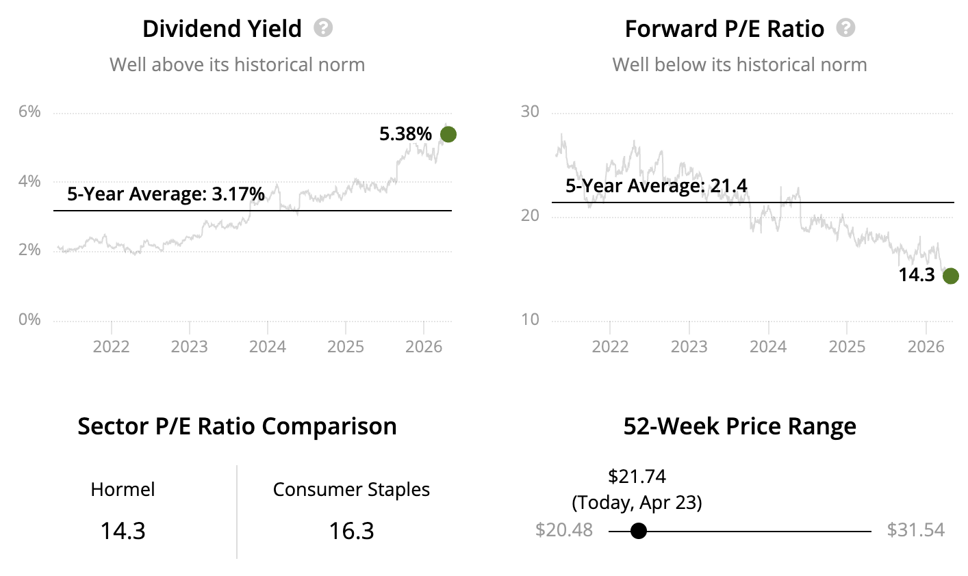 Hormel Foods was founded in 1891 and is a branded food company focused on packaged meats, refrigerated foods, and convenient meal solutions. Its portfolio includes well-known brands such as Spam, Applegate, Jennie-O, and Skippy, with distribution across retail and foodservice.