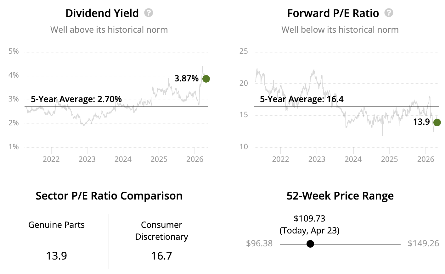 Founded in 1928, Genuine Parts distributes automotive and industrial replacement parts through brands such as NAPA and other international operations. Its business benefits from ongoing maintenance needs, since vehicles and equipment require parts regardless of the economic cycle. Note that the firm is separating its auto and industrial businesses into two companies, with the split expected to take place in early 2027.